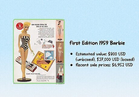 First Edition 1959 Barbie When the Barbie doll first released in 1959, she instantly became an icon with her striped swimsuit and sunglasses. Barbies have only gotten more popular and more valuable over the years, so the original dolls now sell for a lot of money. Estimated value: $800 USD (unboxed), $27,000 USD (boxed) Recent sale prices: $6,952 USD A lot of other recent Barbie dolls are worth a lot of money too! Check out our Barbie value guide to see if you have any at home. Meet the wikiHow Experts Reyne Hirsch is an antiques expert and appraiser with more than 25 years of experience and has appeared on 13 seasons of Antiques Roadshow. Jeff Friesen is a LEGO artist who has published 6 books and been featured on The LEGO Group’s official feeds.