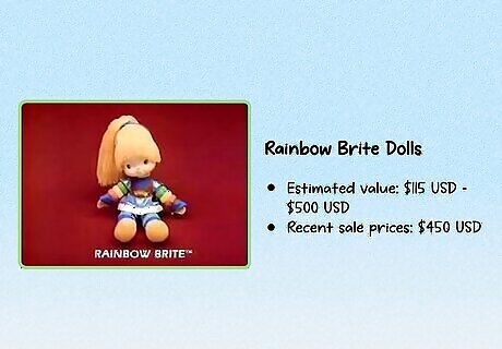Rainbow Brite Dolls Rainbow Brite dolls were released by Mattel in the '80s as a tie-in to the animated series. These dolls have bright rainbow-colored clothing and long, yarn hair that made them stand out from other dolls around the same time. While new merch is still being made, the classic dolls have grown in value. Estimated value: $115–500 USD Recent sale prices: $450 USD