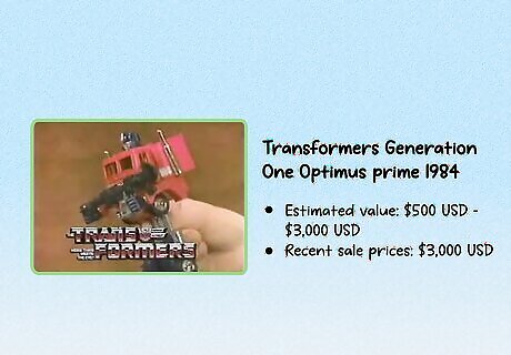 Transformers action figures Transformers was one of the coolest toys because they were cars and action figures at the same time. The series has only gotten more popular since it premiered in the '80s, and fans are still looking for some of the classics, like Optimus Prime and Megatron. Estimated value: $500–3,000 USD Recent sale prices: $3,000 USD