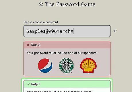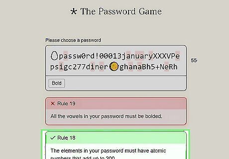 The atomic number of all elements must add up to 200. When you get to Rule 18, you might see some letters or letter combos highlighted in your password. The letters highlighted correspond to one- or two-letter element symbols (such as O for oxygen, He for helium, Ir for iridium, etc.). Each of these elements has an atomic weight, and you must include a combination of elements that have atomic numbers that add up to 200. The best way to get through this rule is to avoid capital letters in your password as much as possible, except where required. The elemental symbols you choose should ideally not start with a Roman numeral (I, V, X, L, C, D, or M) and should not contain any vowels, to avoid messing up later rules. Since Rule 12 requires you to have a two-letter symbol for an element from the periodic table, you'll need to have at least one two-letter symbol in your password to begin with.