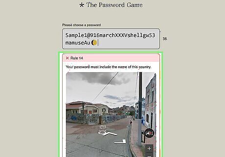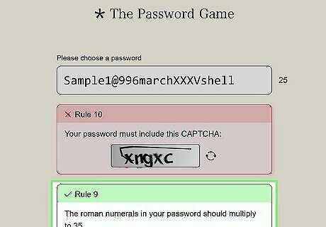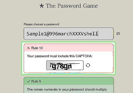 Rule 10 In Rule 10, you'll be required to type out a CAPTCHA to add it to your password. Oftentimes, these CAPTCHAs will have numbers in them. There are two ways to deal with this rule: Refresh the CAPTCHA until you get one without capital letters. There's a little arrow button next to the CAPTCHA that you can use to refresh it. This is the preferred way to deal with this rule. You should also look for a CAPTCHA without any numbers to avoid messing up some of the other rules in the game. Type the CAPTCHA as is, then adjust the element symbols you've chosen as needed. You may not even have to adjust your element symbols if the capital letters in the CAPTCHA don't correlate to any elements on the periodic table.