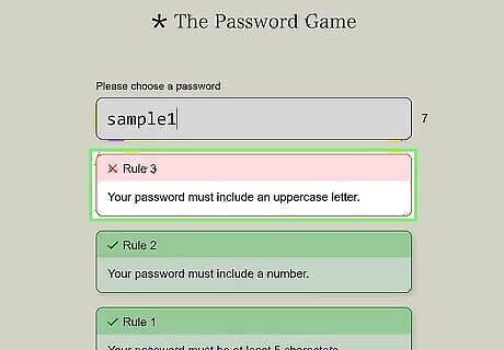 Rule 3 Rule 3 requires your password to have an uppercase letter. The easiest way to get around this rule is to simply delete the previous uppercase letter you added to your password, or ensure that the uppercase letter doesn't create a one- or two-letter elemental symbol. Ideally, the uppercase letter also isn't a Roman numeral nor a vowel, to avoid messing up other rules in the game.