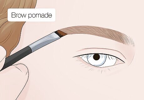 Apply brow pomade to weigh down your cowlick. Like the gel, brow pomade can hold down your cowlick after you restyle it in the right direction. It can also fill in sparse-looking areas of your brow that’re left over after trimming it. Don’t be afraid to experiment with different brow gels and brow pomades to see if one works better than the other for you! You can use a spoolie brush to comb your eyebrow cowlick in the right direction before applying the pomade. If you want double the security, you can also add a quick swipe of clear eyebrow gel after the pomade.
